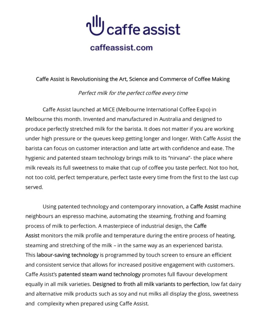 Photos and videos are on instagram @caffeassist and website and more available upon request.